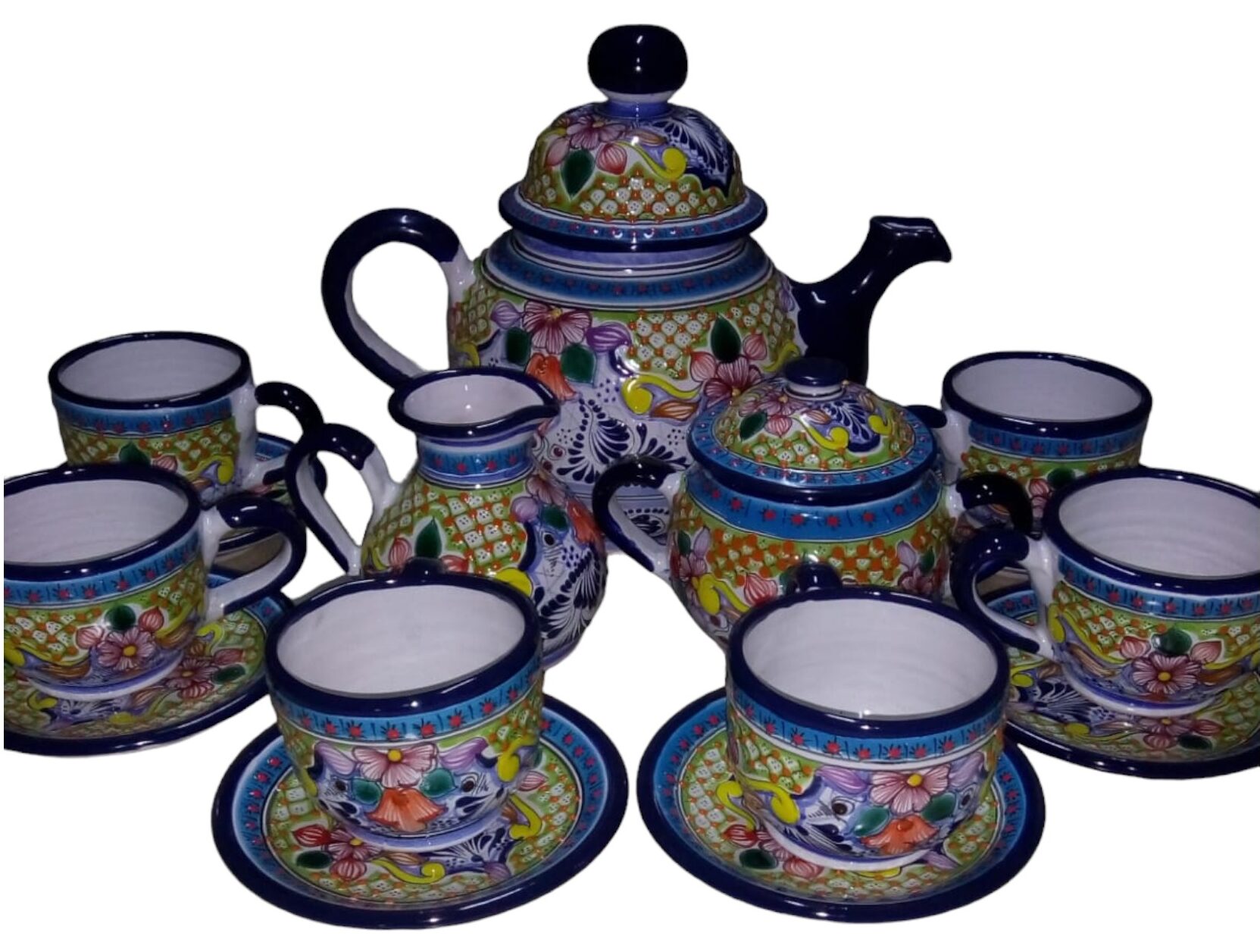 Juego de café para 6 personas compuesto por 6 platos (diámetro: 15 cm), 6 tazas de café (diámetro: 6.5 cm, altura: 5 cm, ancho con asa: 9 cm, capacidad: 2 oz), 1 cafetera, 1 azucarera y 1 cremera. Todas las piezas son de cerámica mayólica con tonos minerales metálicos, elaboradas con barro y arcillas de alta calidad, decoradas con colores minerales que aportan elegancia y distinción.