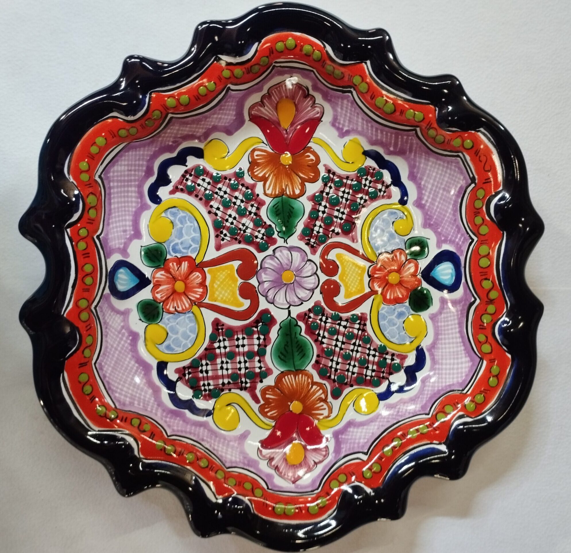 Platón imperial de 40 cm de largo x 40 cm ancho. Hecho de cerámica mayólica con tonos minerales metálicos. Fabricado con barro y arcillas de alta calidad, decorado con colores minerales que le aportan un toque elegante y único.